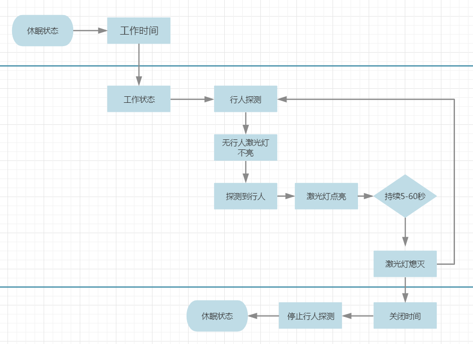 激光光束工作0-60秒(可調)后停止;在啟動期 間如再次有人經過,點亮時間向后延時,最后一個行人經過激光傳感器0-60秒(可調)后設備停止發光